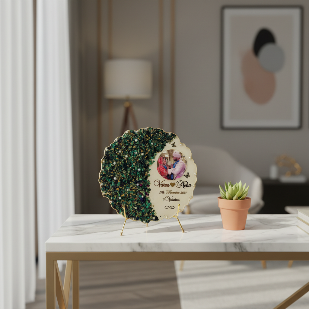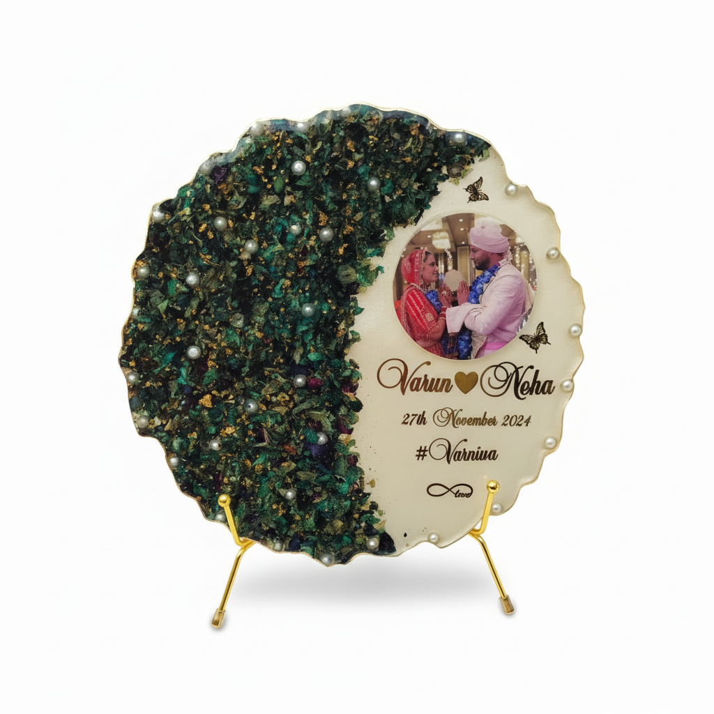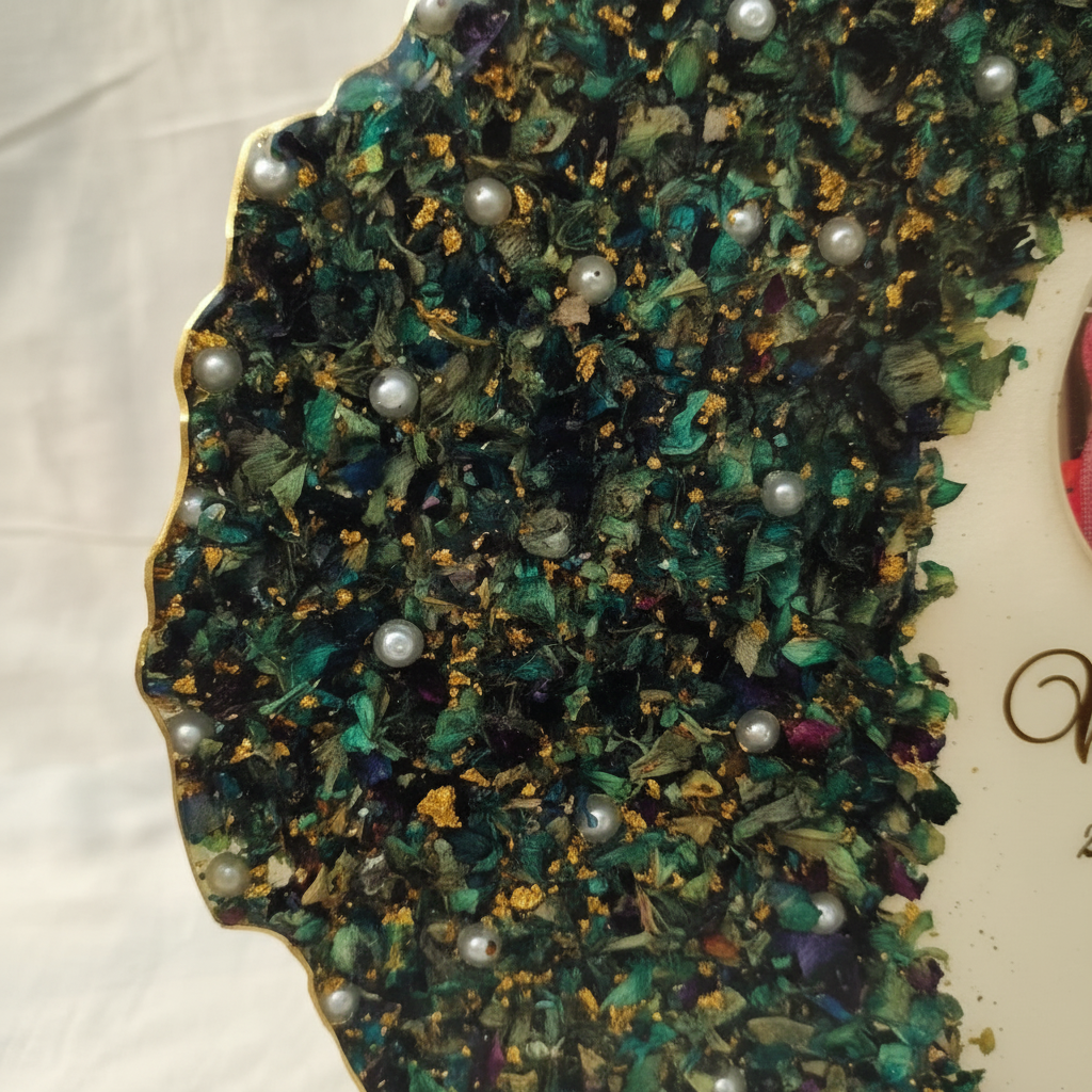 Each frame is meticulously handcrafted to transform your wedding garland into a timeless work of art. The deep mold resin technique ensures your flowers are perfectly preserved, maintaining their beauty for a lifetime. The scalloped edge design with pearl embellishments adds a touch of elegance, while the personalized gold text makes each piece uniquely yours.