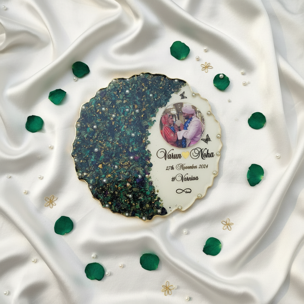 Preserve the precious memories of your wedding day with our exquisite handcrafted varmala preservation frame. This stunning scalloped-edge resin keepsake features your wedding garland beautifully preserved in crystal-clear resin, adorned with golden preserved flowers, delicate pearls, and elegant gold accents.